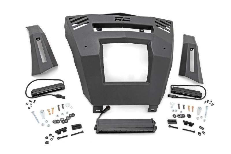 Superior Function: Upgrade your Can-Am Defender's front end with Rough Country's Front Bumper Kit, now available with optional 6" Slimline LED lights in the wings or a 12" Black Series light bar in the center. This rugged bolt-on kit installs easily and follows your Defender's factory lines, giving your UTV a more aggressive, modern appearance while delivering exceptional front-end illumination for night or low-light adventures.Innovative, Durable Design: Crafted from 1/8" heavy-duty steel with a corrosion-resistant powder coat finish, these panels are built to withstand off-road impacts and tough elements. The removable outer wings allow for customization or accessory installation. Lighting options include dual 6" Slimline LED lights in the wings producing 4,800 lumens, or a full setup with dual 6" lights plus a 12" single-row Black Series light bar delivering a combined 9,600 lumens. Each LED light features IP67 waterproofing, ensuring reliable performance in all weather conditions. Effortless Installation: This 100% bolt-on bumper kit is designed for straightforward installation with standard tools. Estimated install time is 3-4 hours, with step-by-step instructions included, so you can upgrade your Defender at home quickly and efficiently.Limited Lifetime Replacement Warranty: Every Rough Country Front Bumper Kit is backed by a limited lifetime replacement warranty against manufacturer defects. Rest easy knowing your investment is protected from structural or workmanship issues, giving you confidence on every ride.