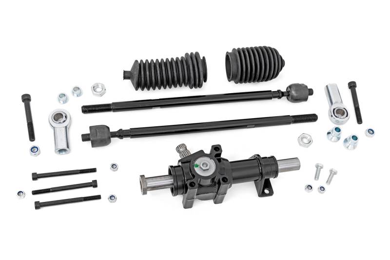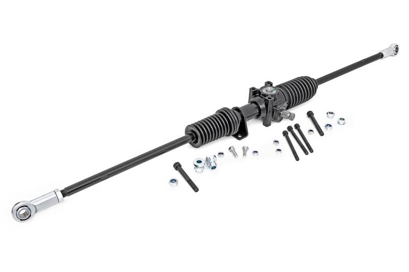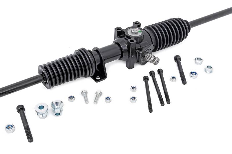 Take Control of Your Ride: Don't let sloppy steering hold you back. Rough Country's upgraded Rack and Pinion Kit for the Polaris Ranger XP 1000 delivers precise, responsive steering so you can confidently tackle any trail or off-road challenge. Engineered for performance and durability, this kit ensures your Ranger follows your lead every time.Built Tough for Any Terrain: Designed with a 22mm knuckle connection shaft and 18.8mm spline diameter, this heavy-duty rack and pinion outperforms the stock OE components. With 3.33 steering turns for sharper control, increased 1.5NM driving torque, and reinforced 5/8-18 connection threads, your Ranger gains superior handling and strength. Finished in black E-Coat and housed in powder-coated steel, it's built to resist corrosion, chips, and rough conditions while looking as rugged as it performs.Simple Installation and Reliability: Rough Country includes all necessary hardware for a quick, hassle-free installation, getting you back on the trail faster. Backed by our industry-leading limited warranty, this upgraded rack and pinion offers long-lasting durability and peace of mind with every ride.