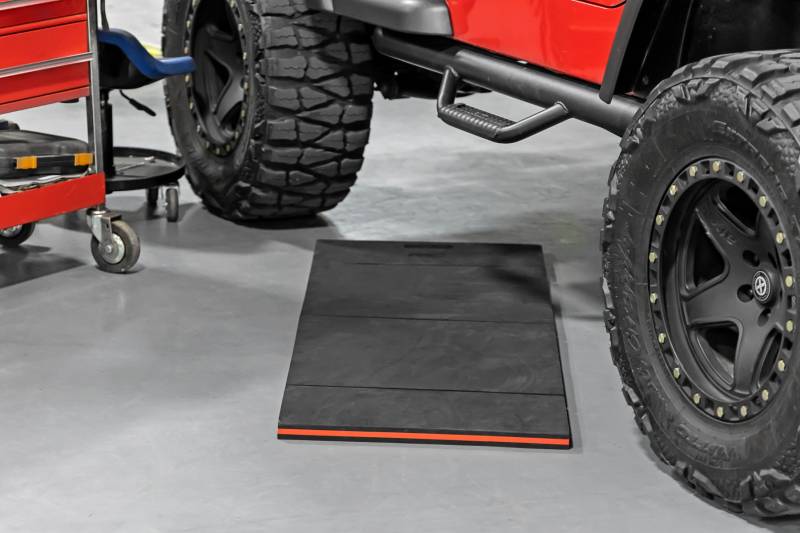 Added Comfort! Gone are the days of laying on the ground while wrenching on your rig. Here at Rough Country, we are keeping the handyman in mind and have created the next must-have product for your garage. Introducing Rough Country's Utility Mat line!\ Innovative Design and Storage Capabilities. Rough Country's Utility Mats are made of a durable 1.25 inch thick EVA Foam material and have a chemical-resistant surface. EVA Foam is a lightweight non-toxic anti-fatigue material that aids in assisting your joints by providing a comfortable work area. Featuring a 22" wide x 57" long pad this not only provides a broad work area but can be folded to allow for different positions protecting your knees or back! Offering a convenient handle this mat can be purchased in a two or six-fold design storage possibilities are endless. \ Easy Cleanup. After you have tackled the task at hand, rest easy knowing that Rough Country's Utility Mats can be cleaned easily using soap and water.