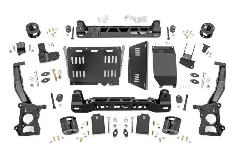 - Improved Ground Clearance: Tackle uneven terrain with added underbody space for better off-road capability.\ Bold, Aggressive Stance: Achieve a commanding look that turns heads on the street or trail.\ Front-to-Rear Leveling: Eliminates factory rake for a balanced ride height and cleaner profile.\ Designed for Compatibility: Accommodates the factory locking front differential for full functionality and performance.\ Enhanced Undercarriage Protection: Includes additional skid plates to safeguard the hydraulic sway bar disconnect from trail hazards and debris.\ Retains Factory Beadlock Compatibility: Supports factory-capable 17x8.5 +30 offset beadlock wheels for rugged performance..