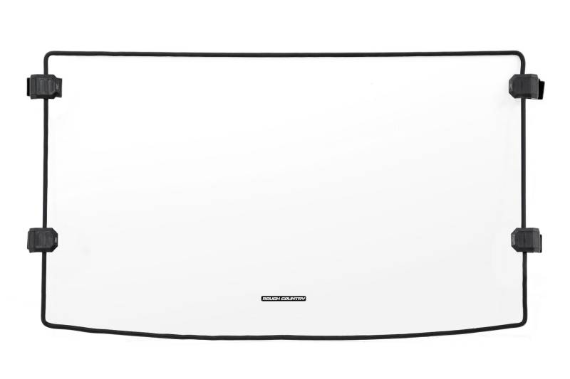 Added Protection and comfortability. Protect the occupants of your Polaris Ranger from off-road hazards such as rocks, branches, and other debris with Rough Country's Scratch-Resistant Windshields. UTV Windshields offer a clear visual of the trail ahead and allow for a much more comfortable outing!\ High-Quality Polycarbonate Construction. Rough Country UTV windshields are constructed from thick polycarbonate material that is precision cut for a perfect fit. ?áThe polycarbonate material provides an ideal combination of clarity, flexibility, durability that outperforms glass, acrylic, and other windshield materials.?á\ Durable Scratch and UV Resistance. Each windshield is not only constructed from thick polycarbonate material but enhanced by a secondary AR2 hard-coating process.?á This process completely coats the windshield with a hardened, scratch-resistant barrier.?á This treatment also provides the additional benefit of UV protection.\ Easy Installation.?áWith a simple strap-on installation process, installing a Rough Country windshield couldn't be easier.?á Within 15 ?Çô 30 mins you can be ready to hit the trails. ?á\ Limited-Lifetime Replacement Warranty. Rough Country's Scratch-Resistant Windshields are backed with a limited lifetime replacement warranty towards manufacturer defects. As such, the product is protected from structural and workmanship damage after the date of purchase. With our industry-leading warranty give yourself peace of mind when using Rough Country's Suspension products!