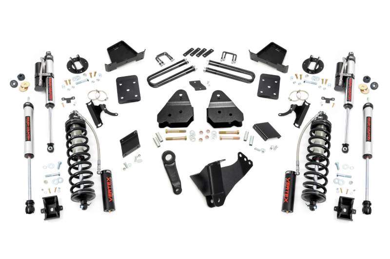 Explore New Heights. Give your third-generation Ford Super Duty superior lift height with Rough Country's 4.5-inch Coilover Suspension Lift Kit! This all-inclusive kit comes with everything you need for a total transformation of your truck. Run up to 35in tires while preserving the smooth, factory ride quality with this impressive upgrade.\ Durable Components. When changing a vehicle's suspension, the key to preserving ride quality is keeping the geometry of all suspension components as close to their factory angles as possible. Rough Country's new 4.5-inch Suspension Lift features a set of ultra-durable radius arm drop brackets, precision fit to bolt right into the factory mounts for an easier install and a more factory-like angle. Utilizing this conversion kit you're removing the factory independent coil shock and coil set-up and replacing it with a massive 2.5in piston, nitrogen-charged, 8-stage adjustable Vertex Coilover. Rough CountryΓÇÖs Vertex Coilovers feature a monotube design with an external reservoir for increased oil capacity and damping sensitivity. When it comes to investing in a high-end kit, youΓÇÖll be pleased to find that Rough CountryΓÇÖs 2.5in piston design is beefier and offers an impressive 56% greater fluid capacity than the average reservoir shock. Each kit is paired with a monotube shock that provides optimal damping control.\ Installation. Requiring cutting and drilling to install, an estimated timeframe of 6-10 hours is recommended to complete this full installation. This full kit can be installed at home and can be completed efficiently and quickly!\ Limited Lifetime Replacement Warranty. Rough Country's 4.5-inch Coilover Suspension Lift Kit is backed with a limited lifetime replacement warranty towards manufacturer defects. As such, the product is protected from structural and workmanship damage after the date of purchase. With our industry-leading warranty give yourself peace of mind when using Rough Country's Suspension products!
