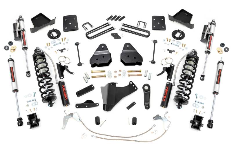 Explore New Heights. Give your second-generation Ford Super Duty superior lift height with Rough Country's 4.5-inch Coilover Suspension Lift Kit! This all-inclusive kit comes with everything you need for a total transformation of your truck. Run up to 35in tires while preserving the smooth, factory ride quality with this impressive upgrade.\ Durable Components. When changing a vehicle's suspension, the key to preserving ride quality is keeping the geometry of all suspension components as close to their factory angles as possible. Rough Country's new 4.5-inch Suspension Lift features a set of ultra-durable radius arm drop brackets, precision fit to bolt right into the factory mounts for an easier install and a more factory-like angle. Utilizing this conversion kit you're removing the factory independent coil shock and coil set-up and replacing it with a massive 2.5in piston, nitrogen-charged, 8-stage adjustable Vertex Coilover. Rough CountryΓÇÖs Vertex Coilovers feature a monotube design with an external reservoir for increased oil capacity and damping sensitivity. When it comes to investing in a high-end kit, youΓÇÖll be pleased to find that Rough CountryΓÇÖs 2.5in piston design is beefier and offers an impressive 56% greater fluid capacity than the average reservoir shock. Each kit is paired with a monotube shock that provides optimal damping control.\ Installation. Requiring cutting and drilling to install, an estimated timeframe of 6-10 hours is recommended to complete this full installation. This full kit can be installed at home and can be completed efficiently and quickly!\ Limited Lifetime Replacement Warranty. Rough Country's 4.5-inch Coilover Suspension Lift Kit is backed with a limited lifetime replacement warranty towards manufacturer defects. As such, the product is protected from structural and workmanship damage after the date of purchase. With our industry-leading warranty give yourself peace of mind when using Rough Country's Suspension products!