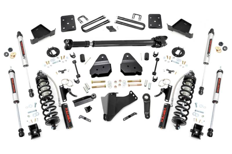 Explore New Heights. Give your fourth-generation Ford Super Duty superior lift height with Rough Country's 4.5-inch Coilover Suspension Lift Kit! This all-inclusive kit comes with everything you need for a total transformation of your truck. Run up to 35in tires while preserving the smooth, factory ride quality with this impressive upgrade.\ Durable Components. When changing a vehicle's suspension, the key to preserving ride quality is keeping the geometry of all suspension components as close to their factory angles as possible. Rough Country's new 4.5-inch Suspension Lift features a set of ultra-durable radius arm drop brackets, precision fit to bolt right into the factory mounts for an easier install and a more factory-like angle. Utilizing this conversion kit you're removing the factory independent coil shock and coil set-up and replacing it with a massive 2.5in piston, nitrogen-charged, 8-stage adjustable Vertex Coilover. Rough Country’s Vertex Coilovers feature a monotube design with an external reservoir for increased oil capacity and damping sensitivity. When it comes to investing in a high-end kit, you’ll be pleased to find that Rough Country’s 2.5in piston design is beefier and offers an impressive 56% greater fluid capacity than the average reservoir shock. Each kit is paired with a monotube shock that provides optimal damping control.\ Installation. Requiring cutting and drilling to install, an estimated timeframe of 6-10 hours is recommended to complete this full installation. This full kit can be installed at home and can be completed efficiently and quickly!\ Limited Lifetime Replacement Warranty. Rough Country's 6-inch Coilover Suspension Lift Kit is backed with a limited lifetime replacement warranty towards manufacturer defects. As such, the product is protected from structural and workmanship damage after the date of purchase. With our industry-leading warranty give yourself peace of mind when using Rough Country's Suspension products!