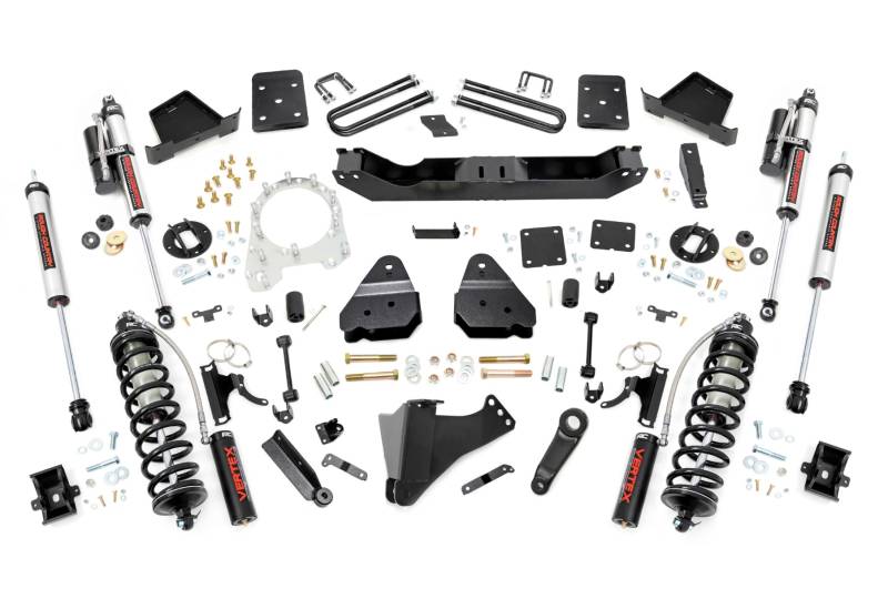 Explore New Heights. Give your fourth-generation Ford Super Duty superior lift height with Rough Country's 4.5-inch Coilover Suspension Lift Kit! This all-inclusive kit comes with everything you need for a total transformation of your truck. Run up to 35in tires while preserving the smooth, factory ride quality with this impressive upgrade.\ Durable Components. When changing a vehicle's suspension, the key to preserving ride quality is keeping the geometry of all suspension components as close to their factory angles as possible. Rough Country's new 4.5-inch Suspension Lift features a set of ultra-durable radius arm drop brackets, precision fit to bolt right into the factory mounts for an easier install and a more factory-like angle. Utilizing this conversion kit you're removing the factory independent coil shock and coil set-up and replacing it with a massive 2.5in piston, nitrogen-charged, 8-stage adjustable Vertex Coilover. Rough Country’s Vertex Coilovers feature a monotube design with an external reservoir for increased oil capacity and damping sensitivity. When it comes to investing in a high-end kit, you’ll be pleased to find that Rough Country’s 2.5in piston design is beefier and offers an impressive 56% greater fluid capacity than the average reservoir shock. Each kit is paired with a monotube shock that provides optimal damping control.\ Installation. Requiring cutting and drilling to install, an estimated timeframe of 6-10 hours is recommended to complete this full installation. This full kit can be installed at home and can be completed efficiently and quickly!\ Limited Lifetime Replacement Warranty. Rough Country's 6-inch Coilover Suspension Lift Kit is backed with a limited lifetime replacement warranty towards manufacturer defects. As such, the product is protected from structural and workmanship damage after the date of purchase. With our industry-leading warranty give yourself peace of mind when using Rough Country's Suspension products!