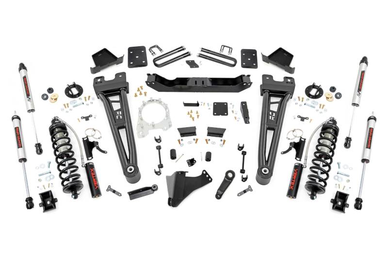 Superior Ride Quality.Take your fourth-generation Ford Super Duty to new heights with Rough Country's 6-inch Radius Arm Coilover Conversion Suspension Lift! This all-inclusive kit comes with everything you need for a total transformation of your truck. Run up to 37in tires while preserving the smooth, factory ride quality with this impressive upgrade.\ When changing a vehicle's suspension, the key to preserving ride quality is keeping the geometry of all suspension components as close to their factory angles as possible. Rough Country's new 6-inch Radius Arm Suspension Lift features a set of ultra-durable Radius Arms, precision fit to bolt right into the factory mounts for an easier install and a more factory-like angle. At 27lbs each, these beefy, upgraded Radius Arms dwarf stock equipment and feature durable durable rubber bushings for maximum vibration absorption. Rough Country’s 6" Radius Coilover Conversion Lift Kit features top-mounted reservoir brackets and coil-over mounts constructed from 1/4-inch steel. Utilizing this conversion kit you're removing the factory independent coil shock and coil set-up and replacing it with a massive 2.5in piston, nitrogen-charged, 8-stage adjustable Vertex Coilover. Rough Country’s Vertex Coilovers feature a monotube design with an external reservoir for increased oil capacity and damping sensitivity. When it comes to investing in a high-end kit, you’ll be pleased to find that Rough Country’s 2.5in piston design is beefier and offers an impressive 56% greater fluid capacity than the average reservoir shock. Each kit is paired with a monotube shock that provides optimal damping control.\ Installation. Requiring cutting and drilling to install, an estimated timeframe of 6-10 hours is recommended to complete this full installation. This full kit can be installed at home and can be completed efficiently and quickly!\ Limited Lifetime Replacement Warranty. Rough Country's 6-inch Radius Arm Coilover Conversion Suspension Lift Kit is backed with a limited lifetime replacement warranty towards manufacturer defects. As such, the product is protected from structural and workmanship damage after the date of purchase. With our industry-leading warranty give yourself peace of mind when using Rough Country's Suspension products!