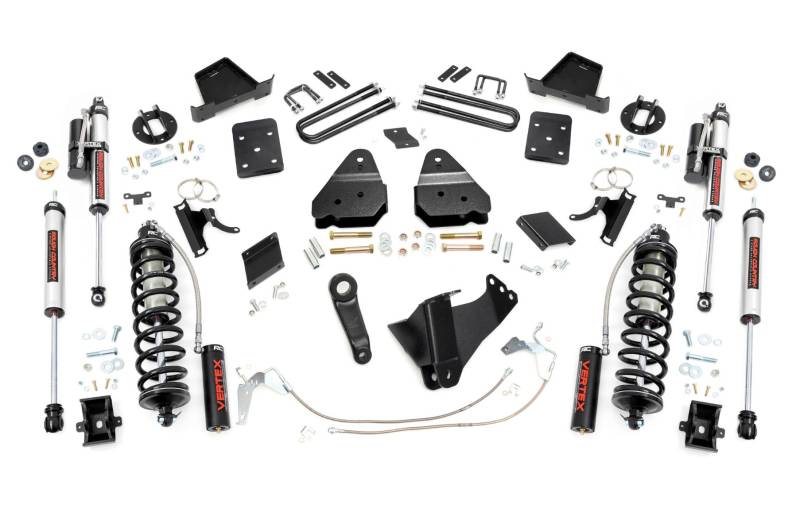 Explore New Heights. Give your third-generation Ford Super Duty superior lift height with Rough Country's 6-inch Coilover Suspension Lift Kit! This all-inclusive kit comes with everything you need for a total transformation of your truck. Run up to 37in tires while preserving the smooth, factory ride quality with this impressive upgrade.\ Durable Components. When changing a vehicle's suspension, the key to preserving ride quality is keeping the geometry of all suspension components as close to their factory angles as possible. Rough Country's new 6-inch Suspension Lift features a set of ultra-durable radius arm drop brackets, precision fit to bolt right into the factory mounts for an easier install and a more factory-like angle. Utilizing this conversion kit you're removing the factory independent coil shock and coil set-up and replacing it with a massive 2.5in piston, nitrogen-charged, 8-stage adjustable Vertex Coilover. Rough CountryΓÇÖs Vertex Coilovers feature a monotube design with an external reservoir for increased oil capacity and damping sensitivity. When it comes to investing in a high-end kit, youΓÇÖll be pleased to find that Rough CountryΓÇÖs 2.5in piston design is beefier and offers an impressive 56% greater fluid capacity than the average reservoir shock. Each kit is paired with a monotube shock that provides optimal damping control.\ Installation. Requiring cutting and drilling to install, an estimated timeframe of 6-10 hours is recommended to complete this full installation. This full kit can be installed at home and can be completed efficiently and quickly!\ Limited Lifetime Replacement Warranty. Rough Country's 6-inch Coilover Suspension Lift Kit is backed with a limited lifetime replacement warranty towards manufacturer defects. As such, the product is protected from structural and workmanship damage after the date of purchase. With our industry-leading warranty give yourself peace of mind when using Rough Country's Suspension products!