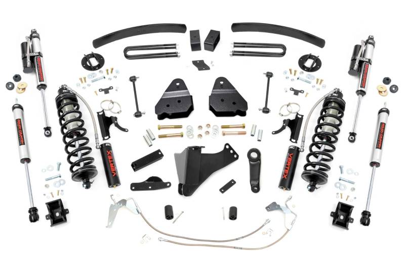 Explore New Heights. Give your second-generation Ford Super Duty superior lift height with Rough Country's 6-inch Coilover Suspension Lift Kit! This all-inclusive kit comes with everything you need for a total transformation of your truck. Run up to 37in tires while preserving the smooth, factory ride quality with this impressive upgrade.\ Durable Components. When changing a vehicle's suspension, the key to preserving ride quality is keeping the geometry of all suspension components as close to their factory angles as possible. Rough Country's new 6-inch Suspension Lift features a set of ultra-durable radius arm drop brackets, precision fit to bolt right into the factory mounts for an easier install and a more factory-like angle. Utilizing this conversion kit you're removing the factory independent coil shock and coil set-up and replacing it with a massive 2.5in piston, nitrogen-charged, 8-stage adjustable Vertex Coilover. Rough CountryΓÇÖs Vertex Coilovers feature a monotube design with an external reservoir for increased oil capacity and damping sensitivity. When it comes to investing in a high-end kit, youΓÇÖll be pleased to find that Rough CountryΓÇÖs 2.5in piston design is beefier and offers an impressive 56% greater fluid capacity than the average reservoir shock. Each kit is paired with a monotube shock that provides optimal damping control.\ Installation. Requiring cutting and drilling to install, an estimated timeframe of 6-10 hours is recommended to complete this full installation. This full kit can be installed at home and can be completed efficiently and quickly!\ Limited Lifetime Replacement Warranty. Rough Country's 6-inch Coilover Suspension Lift Kit is backed with a limited lifetime replacement warranty towards manufacturer defects. As such, the product is protected from structural and workmanship damage after the date of purchase. With our industry-leading warranty give yourself peace of mind when using Rough Country's Suspension products!
