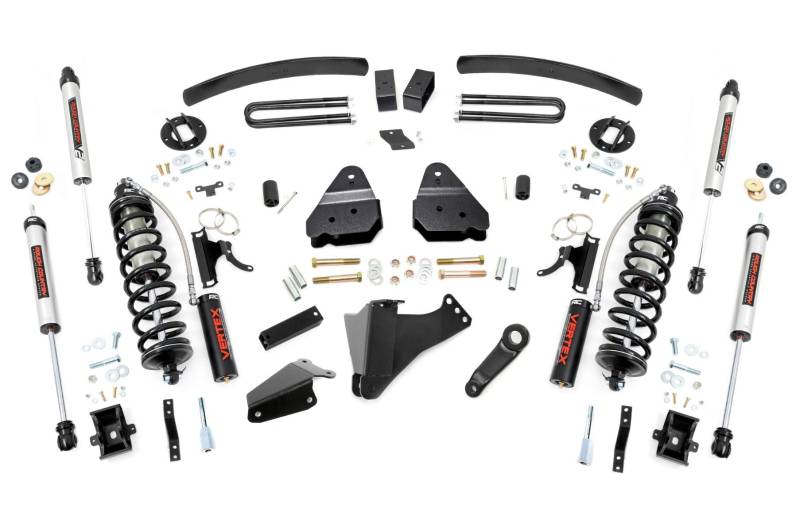 Explore New Heights. Give your first-generation Ford Super Duty superior lift height with Rough Country's 6-inch Coilover Suspension Lift Kit! This all-inclusive kit comes with everything you need for a total transformation of your truck. Run up to 37in tires while preserving the smooth, factory ride quality with this impressive upgrade.\ Durable Components. When changing a vehicle's suspension, the key to preserving ride quality is keeping the geometry of all suspension components as close to their factory angles as possible. Rough Country's new 6-inch Suspension Lift features a set of ultra-durable radius arm drop brackets, precision fit to bolt right into the factory mounts for an easier install and a more factory-like angle. Utilizing this conversion kit you're removing the factory independent coil shock and coil set-up and replacing it with a massive 2.5in piston, nitrogen-charged, 8-stage adjustable Vertex Coilover. Rough CountryΓÇÖs Vertex Coilovers feature a monotube design with an external reservoir for increased oil capacity and damping sensitivity. When it comes to investing in a high-end kit, youΓÇÖll be pleased to find that Rough CountryΓÇÖs 2.5in piston design is beefier and offers an impressive 56% greater fluid capacity than the average reservoir shock. Each kit is paired with a monotube shock that provides optimal damping control.\ Installation. Requiring cutting and drilling to install, an estimated timeframe of 6-10 hours is recommended to complete this full installation. This full kit can be installed at home and can be completed efficiently and quickly!\ Limited Lifetime Replacement Warranty. Rough Country's 6-inch Coilover Suspension Lift Kit is backed with a limited lifetime replacement warranty towards manufacturer defects. As such, the product is protected from structural and workmanship damage after the date of purchase. With our industry-leading warranty give yourself peace of mind when using Rough Country's Suspension products!