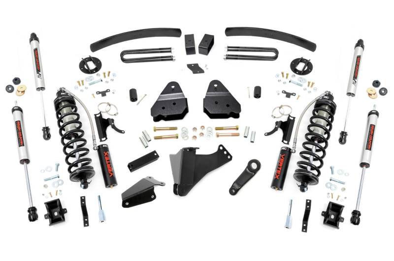 Explore New Heights. Give your first-generation Ford Super Duty superior lift height with Rough Country's 6-inch Coilover Suspension Lift Kit! This all-inclusive kit comes with everything you need for a total transformation of your truck. Run up to 37in tires while preserving the smooth, factory ride quality with this impressive upgrade.\ Durable Components. When changing a vehicle's suspension, the key to preserving ride quality is keeping the geometry of all suspension components as close to their factory angles as possible. Rough Country's new 6-inch Suspension Lift features a set of ultra-durable radius arm drop brackets, precision fit to bolt right into the factory mounts for an easier install and a more factory-like angle. Utilizing this conversion kit you're removing the factory independent coil shock and coil set-up and replacing it with a massive 2.5in piston, nitrogen-charged, 8-stage adjustable Vertex Coilover. Rough Country's Vertex Coilovers feature a monotube design with an external reservoir for increased oil capacity and damping sensitivity. When it comes to investing in a high-end kit, you'll be pleased to find that Rough Country's 2.5in piston design is beefier and offers an impressive 56% greater fluid capacity than the average reservoir shock. Each kit is paired with a monotube shock that provides optimal damping control.\ Installation. Requiring cutting and drilling to install, an estimated timeframe of 6-10 hours is recommended to complete this full installation. This full kit can be installed at home and can be completed efficiently and quickly!\ Limited Lifetime Replacement Warranty. Rough Country's 6-inch Coilover Suspension Lift Kit is backed with a limited lifetime replacement warranty towards manufacturer defects. As such, the product is protected from structural and workmanship damage after the date of purchase. With our industry-leading warranty give yourself peace of mind when using Rough Country's Suspension products!