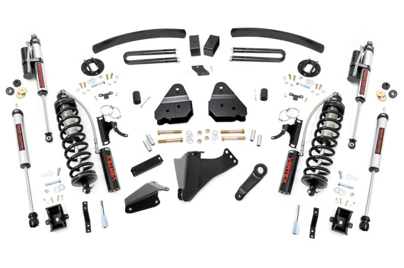 Explore New Heights. Give your first-generation Ford Super Duty superior lift height with Rough Country's 6-inch Coilover Suspension Lift Kit! This all-inclusive kit comes with everything you need for a total transformation of your truck. Run up to 37in tires while preserving the smooth, factory ride quality with this impressive upgrade.\ Durable Components. When changing a vehicle's suspension, the key to preserving ride quality is keeping the geometry of all suspension components as close to their factory angles as possible. Rough Country's new 6-inch Suspension Lift features a set of ultra-durable radius arm drop brackets, precision fit to bolt right into the factory mounts for an easier install and a more factory-like angle. Utilizing this conversion kit you're removing the factory independent coil shock and coil set-up and replacing it with a massive 2.5in piston, nitrogen-charged, 8-stage adjustable Vertex Coilover. Rough CountryΓÇÖs Vertex Coilovers feature a monotube design with an external reservoir for increased oil capacity and damping sensitivity. When it comes to investing in a high-end kit, youΓÇÖll be pleased to find that Rough CountryΓÇÖs 2.5in piston design is beefier and offers an impressive 56% greater fluid capacity than the average reservoir shock. Each kit is paired with a monotube shock that provides optimal damping control.\ Installation. Requiring cutting and drilling to install, an estimated timeframe of 6-10 hours is recommended to complete this full installation. This full kit can be installed at home and can be completed efficiently and quickly!\ Limited Lifetime Replacement Warranty. Rough Country's 6-inch Coilover Suspension Lift Kit is backed with a limited lifetime replacement warranty towards manufacturer defects. As such, the product is protected from structural and workmanship damage after the date of purchase. With our industry-leading warranty give yourself peace of mind when using Rough Country's Suspension products!