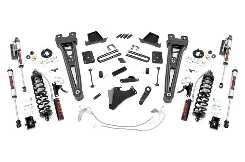 Superior Ride Quality. Take your second-generation Ford Super Duty to new heights with Rough Country's 6-inch Radius Arm Coilover Conversion Suspension Lift! This all-inclusive kit comes with everything you need for a total transformation of your truck. Run up to 37in tires while preserving the smooth, factory ride quality with this impressive upgrade.\ Durable Components. When changing a vehicle's suspension, the key to preserving ride quality is keeping the geometry of all suspension components as close to their factory angles as possible. Rough Country's new 6-inch Radius Arm Suspension Lift features a set of ultra-durable Radius Arms, precision fit to bolt right into the factory mounts for an easier install and a more factory-like angle. At 27lbs each, these beefy, upgraded Radius Arms dwarf stock equipment and feature durable durable rubber bushings for maximum vibration absorption. Rough CountryΓÇÖs 6" Radius Coilover Conversion Lift Kit features top-mounted reservoir brackets and coil-over mounts constructed from 1/4-inch steel. Utilizing this conversion kit you're removing the factory independent coil shock and coil set-up and replacing it with a massive 2.5in piston, nitrogen-charged, 8-stage adjustable Vertex Coilover. Rough CountryΓÇÖs Vertex Coilovers feature a monotube design with an external reservoir for increased oil capacity and damping sensitivity. When it comes to investing in a high-end kit, youΓÇÖll be pleased to find that Rough CountryΓÇÖs 2.5in piston design is beefier and offers an impressive 56% greater fluid capacity than the average reservoir shock. Each kit is paired with a monotube shock that provides optimal damping control.\ Installation. Requiring cutting and drilling to install, an estimated timeframe of 6-10 hours is recommended to complete this full installation. This full kit can be installed at home and can be completed efficiently and quickly!\ Limited Lifetime Replacement Warranty. Rough Country's 6-inch Radius Arm Coilover Conversion Suspension Lift Kit is backed with a limited lifetime replacement warranty towards manufacturer defects. As such, the product is protected from structural and workmanship damage after the date of purchase. With our industry-leading warranty give yourself peace of mind when using Rough Country's Suspension products!