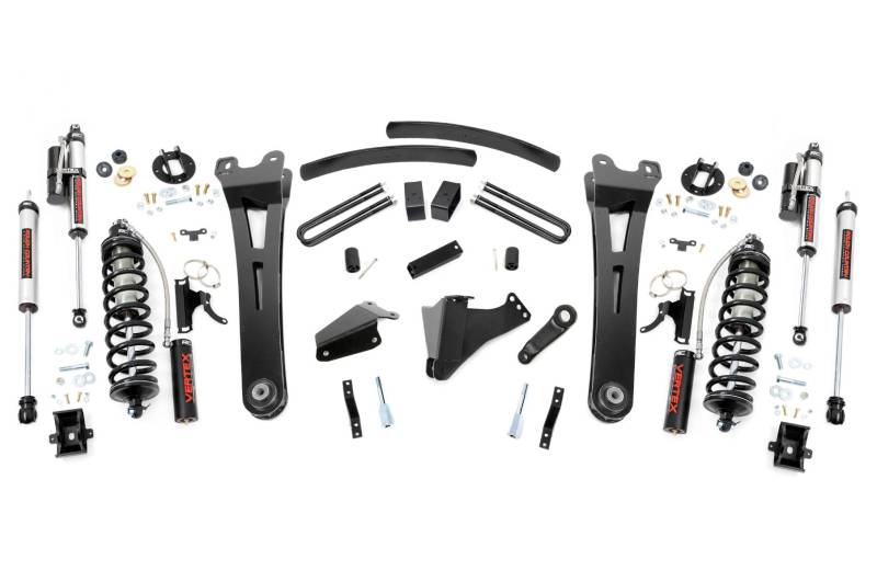 Superior Ride Quality. Take your first-generation Ford Super Duty to new heights with Rough Country's 6-inch Radius Arm Coilover Conversion Suspension Lift! This all-inclusive kit comes with everything you need for a total transformation of your truck. Run up to 37in tires while preserving the smooth, factory ride quality with this impressive upgrade.\ Durable Components. When changing a vehicle's suspension, the key to preserving ride quality is keeping the geometry of all suspension components as close to their factory angles as possible. Rough Country's new 6-inch Radius Arm Suspension Lift features a set of ultra-durable Radius Arms, precision fit to bolt right into the factory mounts for an easier install and a more factory-like angle. At 27lbs each, these beefy, upgraded Radius Arms dwarf stock equipment and feature durable durable rubber bushings for maximum vibration absorption. Rough CountryΓÇÖs 6" Radius Coilover Conversion Lift Kit features top-mounted reservoir brackets and coil-over mounts constructed from 1/4-inch steel. Utilizing this conversion kit you're removing the factory independent coil shock and coil set-up and replacing it with a massive 2.5in piston, nitrogen-charged, 8-stage adjustable Vertex Coilover. Rough CountryΓÇÖs Vertex Coilovers feature a monotube design with an external reservoir for increased oil capacity and damping sensitivity. When it comes to investing in a high-end kit, youΓÇÖll be pleased to find that Rough CountryΓÇÖs 2.5in piston design is beefier and offers an impressive 56% greater fluid capacity than the average reservoir shock. Each kit is paired with a monotube shock that provides optimal damping control.\ Installation. Requiring cutting and drilling to install, an estimated timeframe of 6-10 hours is recommended to complete this full installation. This full kit can be installed at home and can be completed efficiently and quickly!\ Limited Lifetime Replacement Warranty. Rough Country's 6-inch Radius Arm Coilover Conversion Suspension Lift Kit is backed with a limited lifetime replacement warranty towards manufacturer defects. As such, the product is protected from structural and workmanship damage after the date of purchase. With our industry-leading warranty give yourself peace of mind when using Rough Country's Suspension products!
