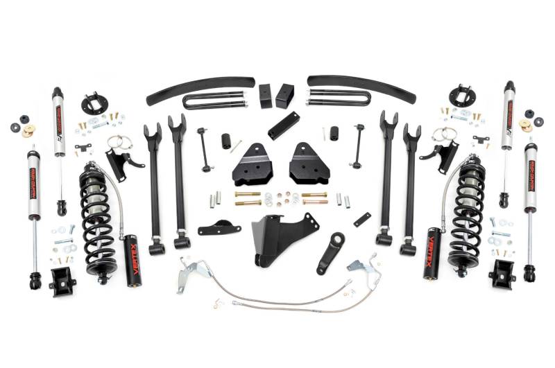 Superior Ride Quality. Give your second-generation Ford Super Duty an impressive upgrade and incredible ride quality with Rough CountryΓÇÖs 4-Link Coilover Conversion Lift Kit! This must-have kit is the pinnacle of suspension upgrades. Providing ride height adjustability, increased dampening, and killer good looks. You're sure to set yourself apart from the pack. This innovative kit allows you to replace your factory arms with a 4-Link setup, using Rough CountryΓÇÖs durable, fixed upper arms and adjustable lower control arms. A set of radius arm drop brackets maintain proper geometry and allow for proper caster setting, which is crucial to maintaining factory handling.\ Durable Components. Rough CountryΓÇÖs 6" 4-Link Coilover Conversion Lift Kit features top-mounted reservoir brackets and coil-over mounts constructed from 1/4-inch steel. Utilizing this conversion kit you're removing the factory independent coil shock and coil set-up and replacing it with a massive 2.5in piston, nitrogen-charged, 8-stage adjustable Vertex Coilover. Rough CountryΓÇÖs Vertex Coilovers feature a monotube design with an external reservoir for increased oil capacity and damping sensitivity. When it comes to investing in a high-end kit, youΓÇÖll be pleased to find that Rough CountryΓÇÖs 2.5in piston design is beefier and offers an impressive 56% greater fluid capacity than the average reservoir shock. Each kit is paired with a monotube shock that provides optimal damping control.\ Installation. Requiring cutting and drilling to install, an estimated timeframe of 6-10 hours is recommended to complete this full installation. This full kit can be installed at home and can be completed efficiently and quickly!\ Limited Lifetime Replacement Warranty. Rough CountryΓÇÖs 4-Link Coilover Conversion Lift Kit is backed with a limited lifetime replacement warranty towards manufacturer defects. As such, the product is protected from structural and workmanship damage after the date of purchase. With our industry-leading warranty give yourself peace of mind when using Rough Country's Suspension products!