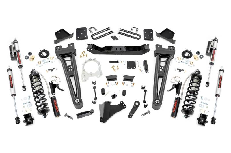 Superior Ride Quality.Take your fourth-generation Ford Super Duty to new heights with Rough Country's 6-inch Radius Arm Coilover Conversion Suspension Lift! This all-inclusive kit comes with everything you need for a total transformation of your truck. Run up to 37in tires while preserving the smooth, factory ride quality with this impressive upgrade.\ When changing a vehicle's suspension, the key to preserving ride quality is keeping the geometry of all suspension components as close to their factory angles as possible. Rough Country's new 6-inch Radius Arm Suspension Lift features a set of ultra-durable Radius Arms, precision fit to bolt right into the factory mounts for an easier install and a more factory-like angle. At 27lbs each, these beefy, upgraded Radius Arms dwarf stock equipment and feature durable durable rubber bushings for maximum vibration absorption. Rough Country’s 6" Radius Coilover Conversion Lift Kit features top-mounted reservoir brackets and coil-over mounts constructed from 1/4-inch steel. Utilizing this conversion kit you're removing the factory independent coil shock and coil set-up and replacing it with a massive 2.5in piston, nitrogen-charged, 8-stage adjustable Vertex Coilover. Rough Country’s Vertex Coilovers feature a monotube design with an external reservoir for increased oil capacity and damping sensitivity. When it comes to investing in a high-end kit, you’ll be pleased to find that Rough Country’s 2.5in piston design is beefier and offers an impressive 56% greater fluid capacity than the average reservoir shock. Each kit is paired with a monotube shock that provides optimal damping control.\ Installation. Requiring cutting and drilling to install, an estimated timeframe of 6-10 hours is recommended to complete this full installation. This full kit can be installed at home and can be completed efficiently and quickly!\ Limited Lifetime Replacement Warranty. Rough Country's 6-inch Radius Arm Coilover Conversion Suspension Lift Kit is backed with a limited lifetime replacement warranty towards manufacturer defects. As such, the product is protected from structural and workmanship damage after the date of purchase. With our industry-leading warranty give yourself peace of mind when using Rough Country's Suspension products!