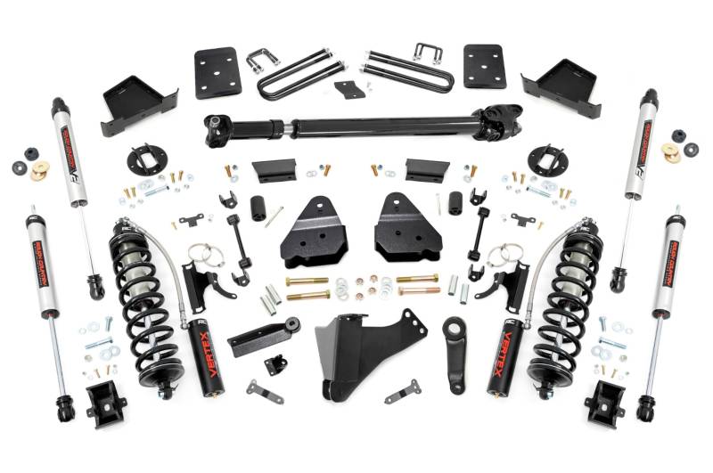 Explore New Heights. Give your fourth-generation Ford Super Duty superior lift height with Rough Country's 6-inch Coilover Suspension Lift Kit! This all-inclusive kit comes with everything you need for a total transformation of your truck. Run up to 37in tires while preserving the smooth, factory ride quality with this impressive upgrade.\ Durable Components. When changing a vehicle's suspension, the key to preserving ride quality is keeping the geometry of all suspension components as close to their factory angles as possible. Rough Country's new 6-inch Suspension Lift features a set of ultra-durable radius arm drop brackets, precision fit to bolt right into the factory mounts for an easier install and a more factory-like angle. Utilizing this conversion kit you're removing the factory independent coil shock and coil set-up and replacing it with a massive 2.5in piston, nitrogen-charged, 8-stage adjustable Vertex Coilover. Rough Country’s Vertex Coilovers feature a monotube design with an external reservoir for increased oil capacity and damping sensitivity. When it comes to investing in a high-end kit, you’ll be pleased to find that Rough Country’s 2.5in piston design is beefier and offers an impressive 56% greater fluid capacity than the average reservoir shock. Each kit is paired with a monotube shock that provides optimal damping control.\ Installation. Requiring cutting and drilling to install, an estimated timeframe of 6-10 hours is recommended to complete this full installation. This full kit can be installed at home and can be completed efficiently and quickly!\ Limited Lifetime Replacement Warranty. Rough Country's 6-inch Coilover Suspension Lift Kit is backed with a limited lifetime replacement warranty towards manufacturer defects. As such, the product is protected from structural and workmanship damage after the date of purchase. With our industry-leading warranty give yourself peace of mind when using Rough Country's Suspension products!