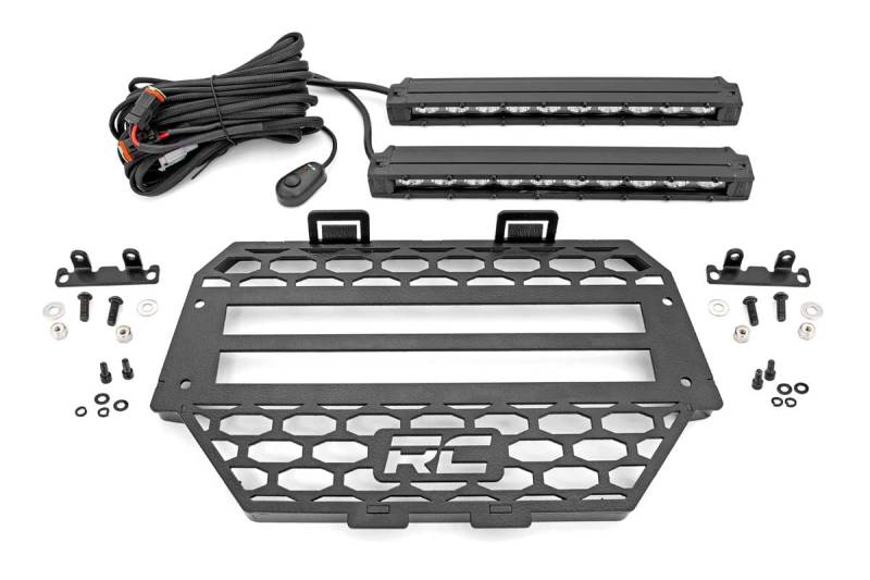 COMMAND THE DARK with Rough Country's 10-inch Slimline LED Grille Kit for Polaris RZR 1000 models. This handy solution includes everything you need to upgrade your RZR with a single or dual Rough Country 10-inch LED light bar mounted into the factory bumper for outstanding illumination. \ Choose between a single or dual LED configuration for the look and output you desire. Each light can be pitched upward, downward, or straight ahead to illuminate however you see fit. \ Whether you're off the beaten path at sunset or gathering all your gear before dawn, you'll be glad to have access to this additional lighting power to tackle the task at hand. With up to 8,000 lumens and 100 watts of high-intensity CREE LED output, you're sure to have plenty of LED power.\ These all-weather lights feature a durable, IP67 Waterproof, die-cast aluminum housing and include a premium wiring harness with toggle switch and in-line fuse. Best of all, this easy-to-install kit features a 100% bolt-on installation procedure allowing you to upgrade your side by side quickly and easily! Don't miss this opportunity to upgrade your UTV with one of the best Polaris RZR 1000 LED accessories available!