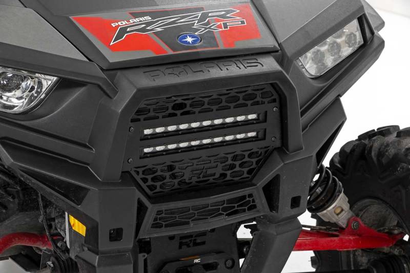 COMMAND THE DARK: Illuminate your trail like never before with Rough Country's 10-inch Slimline LED Grille Kit, designed for Polaris RZR XP 1000 and RZR XP 4 1000 models. This all-in-one kit upgrades your RZR with two 10-inch LED light bars mounted seamlessly into the factory bumper for powerful, forward-facing lighting.Precision Lighting Control: Each light pivots up, down, or straight ahead, giving you total control over your beam pattern to conquer any off-road scenario.Blazing Bright Output: With 8,000 lumens and 100 watts of high-intensity CREE LED output, these lights deliver exceptional brightness and a wide 90-degree flood beam, ensuring you never miss a detail on the trail.Built Tough for All Conditions: Constructed with rugged, die-cast aluminum housing and fully sealed with an IP67 waterproof rating, these lights are ready to handle mud, rain, and harsh off-road conditions. A premium wiring harness with toggle switch and in-line fuse is included for reliable, plug-and-play installation.Hassle-Free Bolt-On Installation: Designed for a 100% bolt-on upgrade, this kit installs quickly and easily, letting you get back on the trail in no time. Don't miss your chance to add one of the most durable and high-performing LED upgrades for your Polaris RZR XP 1000 or RZR XP 4 1000!