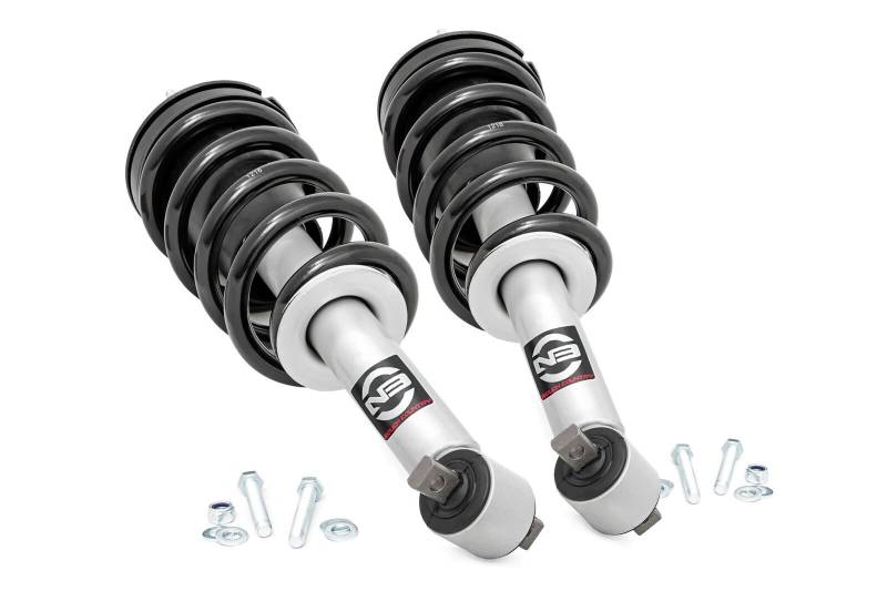 Do you want a great looking truck that still rides like the day you bought it? Our Nitrogen charged, loaded struts add superior ride quality to your truck while maintaining a stock, factory ride height. Each strut includes a pre-loaded coil for lightning-fast installation without the need for complicated strut disassembly.\ Rough Country's Performance N3 Struts feature a massive bore and chrome-hardened piston rod with leak-proof piston seal for exceptional durability during off-road use. Each strut is specifically tuned for its intended application and includes a variable dampening system for outstanding handling and control on all road conditions. These Performance N3 Struts offer improved tire contact with the road for increased stability and performance.\ These struts are engineered to fit perfectly on each intended application, and feature a pre-installed coil spring for easy installation without the need for strut disassembly. Simply remove your factory strut and replace with this easy, convenient system. Add this upgrade to your lift kit for an increased ride quality that mimics the factory responsiveness and handling of the OE strut. Includes a 3-year Limited Warranty.