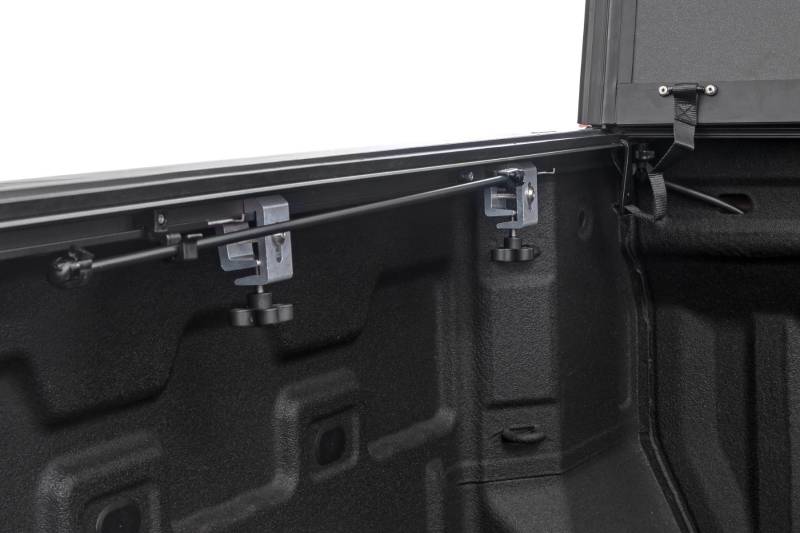 Elevate your Colorado/Canyon's functionality and appearance with Rough Country's GM Hard Tri-fold Flip-up Bed Cover. Unlike traditional bed covers that limit access to your truck bed, our innovative Flip-up design grants you complete access to your truck bed, making it easier to load and unload large items.\ Full-Bed Access: With Rough Country's Tri-fold Flip-up Bed Cover, you can conveniently flip up the cover, allowing full-bed access without the hassle of removing the cover.\ Built to Last: Our bed cover is crafted from lightweight aluminum and boasts a resilient powder coat finish. This coating resists corrosion and wear, ensuring that your truck bed maintains its pristine appearance even in harsh weather conditions.\ Superior Water Drainage System: The bed rails of this bed cover feature an innovative water drainage system. No need to worry about water pooling on your cover or seeping into your truck bed.\ Premium Weather Seals: The Tri-fold cover also includes top-of-the-line weather-resistant seals that create a tight and secure barrier along the bed rails. These seals ensure your cargo remains protected from the elements, even in inclement weather.\ Secure Cargo Storage: Provide added security for your truck bed contents, deterring theft and protecting valuable items.\ Elevate your Colorado/Canyon's truck bed and get full access, unmatched durability, and superior weather protection with Rough Country's Hard Tri-fold Flip-up Bed Cover!