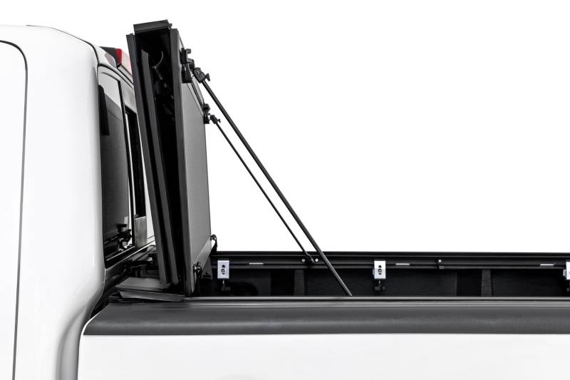 Elevate your Nissan's functionality and appearance with Rough Country's second-generation Frontier Hard Tri-fold Flip-up Bed Cover. Unlike traditional bed covers that limit access to your truck bed, our innovative Flip-up design grants you complete access to your truck bed, making it easier to load and unload large items.\ Full-Bed Access: With Rough Country's Tri-fold Flip-up Bed Cover, you can conveniently flip up the cover, allowing full-bed access without the hassle of removing the cover.\ Built to Last: Our bed cover is crafted from lightweight aluminum and boasts a resilient powder coat finish. This coating resists corrosion and wear, ensuring that your truck bed maintains its pristine appearance even in harsh weather conditions.\ Superior Water Drainage System: The bed rails of this bed cover feature an innovative water drainage system. No need to worry about water pooling on your cover or seeping into your truck bed.\ Premium Weather Seals: The Tri-fold cover also includes top-of-the-line weather-resistant seals that create a tight and secure barrier along the bed rails. These seals ensure your cargo remains protected from the elements, even in inclement weather.\ Secure Cargo Storage: Provide added security for your truck bed contents, deterring theft and protecting valuable items.\ Elevate your Frontier's bed and get full access, unmatched durability, and superior weather protection with Rough Country's Hard Tri-fold Flip-up Bed Cover!