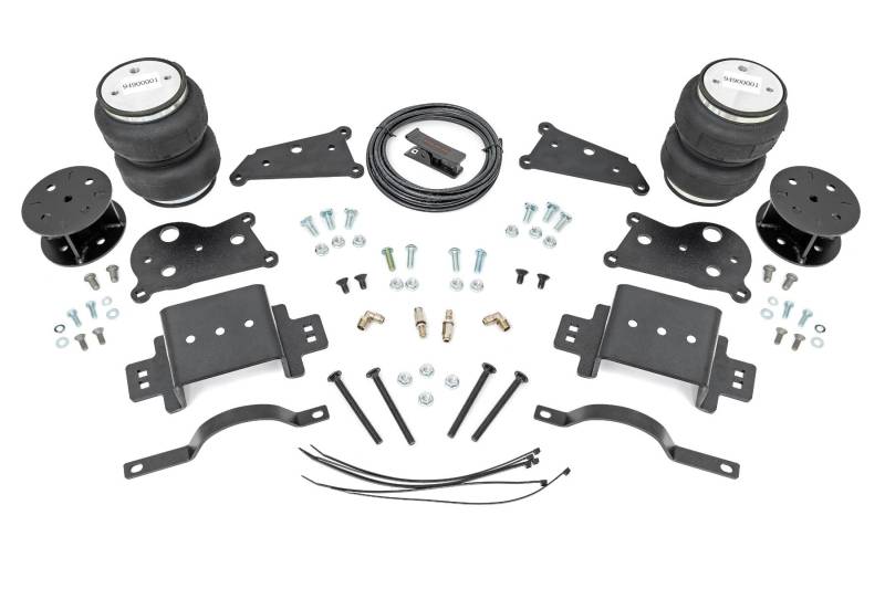 Ideal Leveling. Is your truck your workhorse? The main attraction to the pick-up line is the accessibility to haul and tow as desired. However, due to the amount of weight in the bed, or the condition of the vehicle's rear leaf springs, this can cause the vehicle to be un-level when under load. Here at Rough Country, we created an innovative new product to ensure that these are troubles of the past. Introducing, Rough Country's Rear Air Spring Kit.Heavy-duty Construction. Rough Country's Rear Air Spring Kit features two RC branded high-quality double convoluted airbags complemented with DOT-approved airlines. Whether you plan on towing or hauling in the not-so-distant future Rough Country's Air Spring kit is the must-have accessory to ensure that your trailer is level reducing the weight off of the tongue of your trailer. Each kit offers 1/4" push connector fittings and all of the bracketry needed to ensure installation is lightning fast and secure! Rough Country's Air Spring kit provides up to 5,000 lbs of load support to ensure that you experience less sway and bottoming out when braking and steering! \ Installation. With an estimated timeframe of 1-2 hours this full kit can be installed at home using standard tools and can be completed efficiently and quickly!\ Limited Lifetime Replacement Warranty. Rough Country's Rear Air Spring Kit is backed with a limited-lifetime replacement warranty towards manufacturer defects. As such, the product is protected from structural and workmanship damage after the date of purchase. With our industry-leading warranty give yourself peace of mind when using Rough Country's Suspension products!