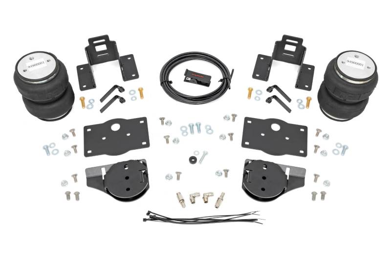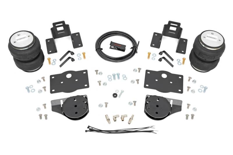 Ideal Leveling. Is your truck your workhorse? The main attraction to the pick-up line is the accessibility to haul and tow as desired. However, due to the amount of weight in the bed, or the condition of the vehicle's rear leaf springs, this can cause the vehicle to be un-level when under load. Here at Rough Country, we created an innovative new product to ensure that these are troubles of the past. Introducing, Rough Country's Rear Air Spring Kit.Heavy-duty Construction. Rough Country's Rear Air Spring Kit features two RC branded high-quality double convoluted airbags complemented with DOT-approved airlines. Whether you plan on towing or hauling in the not-so-distant future Rough Country's Air Spring kit is the must-have accessory to ensure that your trailer is level reducing the weight off of the tongue of your trailer. Each kit offers 1/4" push connector fittings and all of the bracketry needed to ensure installation is lightning fast and secure! Rough Country's Air Spring kit provides up to 5,000 lbs of load support to ensure that you experience less sway and bottoming out when braking and steering! \ Installation. With an estimated timeframe of 1-2 hours this full kit can be installed at home using standard tools and can be completed efficiently and quickly!\ Limited Lifetime Replacement Warranty. Rough Country's Rear Air Spring Kit is backed with a limited-lifetime replacement warranty towards manufacturer defects. As such, the product is protected from structural and workmanship damage after the date of purchase. With our industry-leading warranty give yourself peace of mind when using Rough Country's Suspension products!