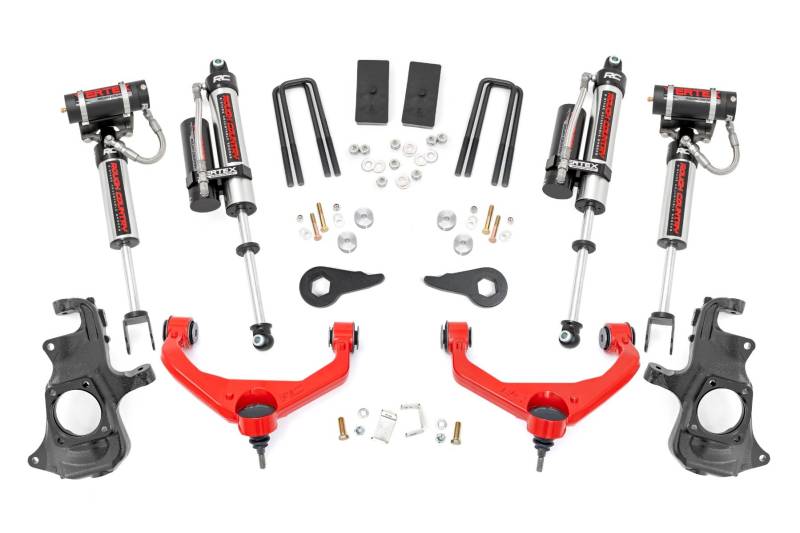 Improved Ground Clearance and Ride Quality: Transform your Sierra or Silverado 2500HD/3500HD with Rough Country's 3.5" Knuckle Lift Kit. Engineered to deliver increased ground clearance, this kit gives your truck the confidence to tackle off-road trails while maintaining smooth, reliable performance on the highway. Choose from Rough Country's premium shock options, N3, M1, V2 monotube shocks, or Vertex reservoir shocks, to match your driving style and maximize ride quality.Innovative Design and Superior Strength: Built for heavy-duty performance, this lift kit features precision-engineered steel knuckles and forged torsion bar keys for uncompromised durability. Forged upper control arms with OEM-style Clevite bushings maintain factory-like geometry and ensure a full range of motion. Differential drop spacers further optimize driveline angles while reducing CV bind. With clearance to run 33" tires (with proper wheel backspacing), your truck gains both function and aggressive style.Premium Control Arm Finishes: Customize your build with upper control arms available in a sleek aluminum finish or bold powdercoated red. Both options deliver rugged strength with a premium look to match your truck's style.Quick and Easy Installation: Designed for a straightforward bolt-on process, this kit requires no cutting, drilling, or welding. With an estimated install time of 4-6 hours and only standard tools needed, you can get your truck lifted and ready to go in a single afternoon.Backed by a Limited Lifetime Warranty: Drive with peace of mind knowing your Rough Country 3.5" Knuckle Lift Kit is protected by our industry-leading limited lifetime replacement warranty. Built tough and backed strong, this suspension system is made to perform as hard as your truck works.