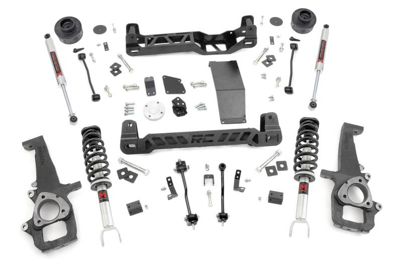 Transform your fourth-generation RAM 1500 with Rough Country's complete 4-inch Suspension Lift Kit. This all-inclusive system delivers an aggressive, commanding stance that perfectly complements your truck's rugged new design.Preserve Your Smooth Factory Ride: Experience the same comfortable and controlled driving feel you love. Our kit maintains a smooth factory-like ride quality so every journey, on-road or off, is just as comfortable as before.Boost Your Ground Clearance for Ultimate Off-Road Confidence: Gain plenty of added clearance to tackle the toughest trails and obstacles with ease. The 4-inch lift lets you run up to massive 35-inch tires for a bold look and enhanced off-road capability.Achieve a Balanced, Aggressive Stance: Level your RAM's front and rear for a sleek, aggressive profile that turns heads everywhere you go. The kit includes precision-engineered front and rear crossmembers, each laser-cut with the iconic RC logo for a fierce yet streamlined appearance.Fully Configurable with Premium Shock Options: Customize your ride quality with shock absorbers that match your driving style, from nitrogen-charged N3 shocks for balanced performance to the premium M1 Monotube shocks for the ultimate ride.Clean Installation with Long-Term Durability: All components are designed with drop brackets and proper geometry to keep your truck looking sharp and functioning flawlessly, no loose parts or unsightly hangers. Backed by Rough Country's Limited Lifetime Replacement Guarantee, this kit is built to last.Upgrade your RAM 1500 with Rough Country's 4-inch Suspension Lift Kit, dominate the trails, look the part, and drive like a champion every mile of the way.