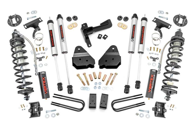 Explore New Heights. Give your fourth-generation Ford Super Duty superior lift height with Rough Country's 3-inch Coilover Suspension Lift Kit! This all-inclusive kit comes with everything you need for a total transformation of your truck. Run up to 35in tires while preserving the smooth, factory ride quality with this impressive upgrade.\ Durable Components. When changing a vehicle's suspension, the key to preserving ride quality is keeping the geometry of all suspension components as close to their factory angles as possible. Rough Country's new 3-inch Suspension Lift features a set of ultra-durable radius arm drop brackets, precision fit to bolt right into the factory mounts for an easier install and a more factory-like angle. Utilizing this conversion kit you're removing the factory independent coil shock and coil set-up and replacing it with a massive 2.5in piston, nitrogen-charged, 8-stage adjustable Vertex Coilover. Rough CountryΓÇÖs Vertex Coilovers feature a monotube design with an external reservoir for increased oil capacity and damping sensitivity. When it comes to investing in a high-end kit, youΓÇÖll be pleased to find that Rough CountryΓÇÖs 2.5in piston design is beefier and offers an impressive 56% greater fluid capacity than the average reservoir shock. Each kit is paired with a monotube shock that provides optimal damping control.\ Installation. Requiring cutting and drilling to install, an estimated timeframe of 5-6 hours is recommended to complete this full installation. This full kit can be installed at home and can be completed efficiently and quickly!\ Limited Lifetime Replacement Warranty. Rough Country's 3-inch Coilover Suspension Lift Kit is backed with a limited lifetime replacement warranty towards manufacturer defects. As such, the product is protected from structural and workmanship damage after the date of purchase. With our industry-leading warranty give yourself peace of mind when using Rough Country's Suspension products!