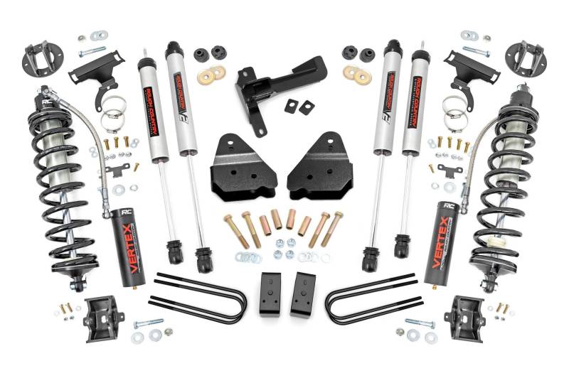 Explore New Heights. Give your second-generation Ford Super Duty superior lift height with Rough Country's 3-inch Coilover Suspension Lift Kit! This all-inclusive kit comes with everything you need for a total transformation of your truck. Run up to 35in tires while preserving the smooth, factory ride quality with this impressive upgrade.\ Durable Components. When changing a vehicle's suspension, the key to preserving ride quality is keeping the geometry of all suspension components as close to their factory angles as possible. Rough Country's new 3-inch Suspension Lift features a set of ultra-durable radius arm drop brackets, precision fit to bolt right into the factory mounts for an easier install and a more factory-like angle. Utilizing this conversion kit you're removing the factory independent coil shock and coil set-up and replacing it with a massive 2.5in piston, nitrogen-charged, 8-stage adjustable Vertex Coilover. Rough Country's Vertex Coilovers feature a monotube design with an external reservoir for increased oil capacity and damping sensitivity. When it comes to investing in a high-end kit, you'll be pleased to find that Rough Country's 2.5in piston design is beefier and offers an impressive 56% greater fluid capacity than the average reservoir shock. Each kit is paired with a monotube shock that provides optimal damping control.\ Installation. Requiring cutting and drilling to install, an estimated timeframe of 5-6 hours is recommended to complete this full installation. This full kit can be installed at home and can be completed efficiently and quickly!\ Limited Lifetime Replacement Warranty. Rough Country's 3-inch Coilover Suspension Lift Kit is backed with a limited lifetime replacement warranty towards manufacturer defects. As such, the product is protected from structural and workmanship damage after the date of purchase. With our industry-leading warranty give yourself peace of mind when using Rough Country's Suspension products!