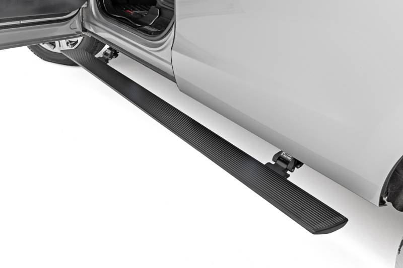 Step up in style. Sidesteps have come a long way, and now we've taken them to the next level with Rough Country's Power Running Boards! These retractable E-Boards tuck tight for a clean look when not in use and automatically extend when the door is opened. With an anti-slip surface that provides a secure stepping area, getting in and out of your ride has never been easier. Our Power Running Boards also include LED lights that provide illumination when deployed and shut off when steps are closed, providing a sleek, aerodynamic look. Premium Construction. The Rough Country E-Board Steps combine durability, strength, and style. These 6" all-season steps are made from lightweight yet durable aluminum and can support up to 660 lbs per side. Equipped with dual motor technology, these steps can handle anything Mother Nature throws their way. They feature an automatic 'SAFE-STOP' mechanism that engages if a blockage is detected and include an interior bypass switch for manual override. So whether you're heading out on a weekend errand or loading up for a camping trip, our electric steps offer reliable protection for all your adventures. Installation. These easy-to-install steps are the perfect solution for getting in and out of your vehicle. No drilling is required for installation, and the steps tuck tight under the rocker panel when not in use. Don't struggle to get in and out of your vehicle anymore. Make life easier with Rough Country's Power Running Boards. Warranty. Rough Country backs its products with a limited lifetime replacement warranty. Our products are protected from structural and workmanship damage after purchase. Our industry-leading warranty gives you peace of mind when using Rough Country products!