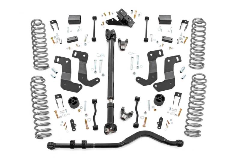 When it comes to your four-door Jeep JL 392 Unlimited, we know you need a lift that won't let you down. Our 3.5 Inch Lift Kit delivers legendary off-road prowess and smooth on-road handling.\ Increased Ground Clearance: Get ready to conquer those rocky trails and rough terrains like a boss! Our lift kit gives your Jeep Wrangler 392 Unlimited the extra inches it needs to clear obstacles with ease.\ Front-to-Rear Leveling: Tired of that nose-down stance? Ditch the unbalanced Jeep life with our leveling kit. We bring symmetry to your ride, lifting the front to match the rear, giving you a smooth and steady journey.\ Tuned Coil Springs for Superior Performance: Your Jeep's handling and ride quality matter, and we get that. Our coil springs come dialed in with OEM spring rates, delivering top-notch handling and a plush ride. Our linear coil rate springs take it up a notch, ensuring impeccable handling and stability, even when the terrain gets wild.\ Additional Tire Clearance: Who doesn't want bigger, beefier tires? Our lift kit makes room for larger tires (up to 35 inches), giving your Jeep a more aggressive look that will turn heads on and off the road!\ Heavy-Duty Track Bar: Our included track bar is an absolute beast, constructed from forged solid steel for unparalleled strength and durability. With its massive 1.25-inch outside diameter and rugged OEM-style rubber bushings, it's built to handle anything the off-road throws its way.\ Durable CV Driveshaft: The factory shaft does not have adequate clearance once lifted and will cause damage to the Rzeppa joint if the driveshaft spins while the suspension is fully flexed or articulated. Rough Country's extended Front CV Driveshaft eliminates this issue allowing you to flex your suspension with more peace of mind!\ Easy Installation: We know you'd rather be off-roading than in the garage all day. That's why our lift kit is designed for easy installation, so you can hit the trails in no time.\