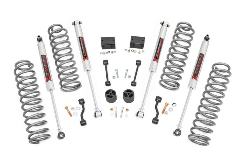 Put the finishing touch on your Jeep Wrangler JL 4-Door Rubicon with Rough Country's 2.5-Inch Suspension Lift Kit. This kit provides the clearance to easily run 35-inch tires, giving your JL a bold, trail-ready stance and taking its off-road performance to new heights.Level Up Your Ride: Eliminate the factory nose-dive and achieve a sleek, leveled look. This lift kit levels the front with the rear, giving your Jeep a rugged stance ready for any trail.Improved Off-Roading Performance: Gain the extra ground clearance needed to tackle challenging trails without worry. Optimized approach, breakover, and departure angles allow your JL to handle tough terrain with confidence.Ride Improvement: Linear coil rate springs enhance handling and load support, improving performance on winding trails and rough terrain.Custom Shock Options: Configure your lift with nitrogen-charged N3 shocks, V2, M1 Monotube, or premium M1R shocks to match your driving style, from comfortable daily use to serious off-road capability.Additional Tire Clearance: This kit clears up to 35-inch tires, giving your Jeep a bold, aggressive look that stands out on and off the road. Easy Bolt-On Installation: A hassle-free, 100% bolt-on design means you can install the lift quickly and get back to the trails without complicated modifications.