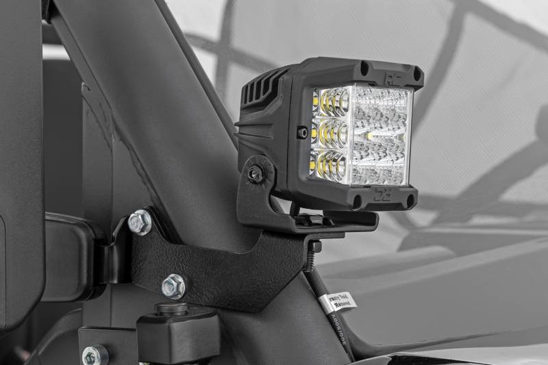 - Easy Bolt-On Installation: Direct-fit design installs quickly with no drilling or cutting required.\ Factory Mirror Mount Location: Cleanly mounts behind the factory mirror using existing hardware for a secure, OEM-style appearance.\ 2 Inch Black Series LED Pods Spot Beam Option: Delivers 4,800 lumens of focused forward lighting for improved trail visibility.\ 2 Inch Black Series LED Pods with DRL Options: Available with cool white or amber DRL lighting, producing 3,600 lumens for added visibility and style.\ 3 Inch OSRAM LED Pod Upgrade: High-output OSRAM LEDs generate an impressive 13,500 lumens for maximum off-road illumination.\ Adjustable Swivel Mount: Allows precise aiming to direct light exactly where you need it.\ Heavy-Duty Steel Brackets: Powder-coated steel construction resists corrosion and stands up to harsh off-road use.\ IP67 Waterproof Protection: Fully sealed against dust and water for reliable performance in all weather conditions.\ Die-Cast Aluminum Housing: Built to dissipate heat efficiently while withstanding extreme riding environments.\ Moisture Breather Technology: Reduces internal condensation to maintain clear, consistent light output.\ Premium Wiring Harness Included: Flat-wound wiring harness with on-off switch ensures a clean, professional installation.\ Backed by a 3 Year Warranty: Rough Country quality and peace of mind you can trust..