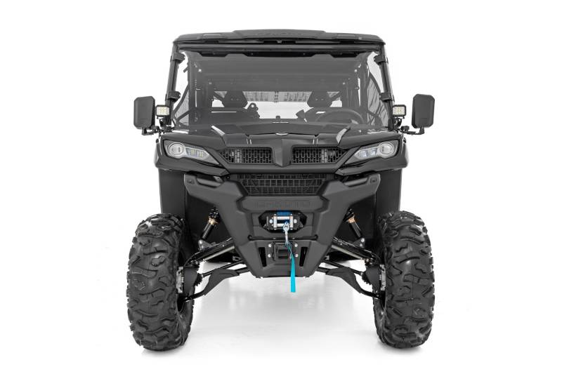 Light Up the Night: Take control of the darkness and upgrade your CFMoto UForce 1000, 1000XL, or U10 Pro with Rough Country's Front Lower Cube Light Mount Kit. Designed to mount cleanly behind the factory mirror location using existing hardware, this bolt-on solution delivers powerful forward lighting without drilling or modifications. Built from heavy-duty 11 gauge steel with a durable powder-coated finish, these mounts provide a secure, OEM-style fit while dramatically improving nighttime visibility on the trail or jobsite.Built for Any Adventure: Choose the lighting performance that fits your needs. Available with 2 inch Black Series LED pods in a focused spot beam producing 4,800 lumens, Black Series LED pods with cool white or amber DRL output producing 3,600 lumens, or step up to the 3 inch OSRAM LED cube delivering an impressive 13,500 lumens. Each pod features an adjustable swivel mount for precise aiming, a rugged die-cast aluminum housing for efficient heat dissipation, and IP67 waterproof protection to withstand mud, rain, and extreme off-road conditions. Integrated Moisture Breather technology helps prevent internal condensation to maintain clear, consistent light output in all environments.Complete Plug-and-Play Kit: This kit includes premium flat-wound wiring with an on off switch for a clean, professional installation. With corrosion-resistant steel brackets and trail-proven LED performance, this setup is built to handle whatever the ride throws your way while keeping the path ahead fully illuminated.Confidence Backed by Warranty: Rough Country products are backed by a limited lifetime replacement warranty against manufacturer defects. With protection against structural and workmanship damage after purchase, you can hit the trails knowing your investment is covered.
