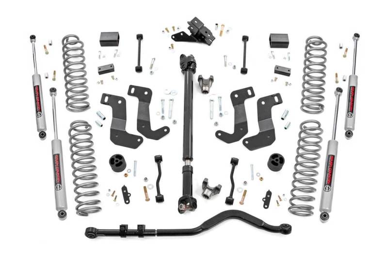 When it comes to your two-door Jeep JL Rubicon, we know you need a lift that won't let you down. Our 3.5 Inch Lift Kit delivers legendary off-road prowess and smooth on-road handling.Increased Ground Clearance: Get ready to conquer those rocky trails and rough terrains like a boss! Our lift kit gives your Jeep Wrangler Rubicon the extra inches it needs to clear obstacles with ease.Front-to-Rear Leveling: Tired of that nose-down stance? Ditch the unbalanced Jeep life with our leveling kit. We bring symmetry to your ride, lifting the front to match the rear, giving you a smooth and steady journey.Tuned Coil Springs for Superior Performance: Your Jeep's handling and ride quality matter, and we get that. Our coil springs come dialed in with OEM spring rates, delivering top-notch handling and a plush ride. Our linear coil rate springs take it up a notch, ensuring impeccable handling and stability, even when the terrain gets wild.Additional Tire Clearance: Who doesn't want bigger, beefier tires? Our lift kit makes room for larger tires (up to 35 inches), giving your Jeep a more aggressive look that will turn heads on and off the road!Heavy-Duty Track Bar: Our included track bar is an absolute beast, constructed from forged solid steel for unparalleled strength and durability. With its massive 1.25-inch outside diameter and rugged OEM-style rubber bushings, it's built to handle anything the off-road throws its way. Durable CV Driveshaft: The factory shaft does not have adequate clearance once lifted and will cause damage to the Rzeppa joint if the driveshaft spins while the suspension is fully flexed or articulated. Rough Country's extended Front CV Driveshaft eliminates this issue allowing you to flex your suspension with more peace of mind!Easy Installation: We know you'd rather be off-roading than in the garage all day. That's why our lift kit is designed for easy installation, so you can hit the trails in no time.