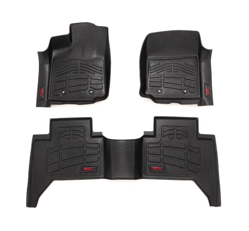 Keeping your ride spotless isn't always easy, especially with the unpredictable weather and accidental spills. Now you can ditch the dirt and keep your ride clean with Rough Country's Sure-Fit Floor Mats!\ All-Weather Protection: Our Sure-Fit Floor Mats are built to conquer any mess, from snow and mud to sand, salt water, and even that mystery puddle you're too afraid to touch. Spilled coffee? Don't sweat it! These mats feature a raised lip design that traps spills before they can reach your carpet. Plus, the textured surface keeps your feet firmly planted (no matter how messy things get).\ \ Sure-Fit Design: Made from tough Thermoplastic Rubber, these mats can handle anything you throw at them. They're flexible enough to contour perfectly to your Tacoma's floor, but strong enough to withstand even the most extreme temperatures. And the best part? They're custom-designed for your ride, so you get a perfect fit with extra coverage, whether you're rocking bucket or bench seats.\ \ Installation is a Breeze: Simply swap out your old mats and put ours in place. And they're just as easy to remove for cleaning, whether you're hitting them with the hose or giving them a quick vacuum. Made with pride in the USA using high-quality materials, they're built to withstand the test of time. And to show we stand behind our product, we offer a Limited Lifetime Warranty, so you can drive with confidence knowing your investment is protected.\ \ With Rough Country's Sure Fit Floor Mats you get the perfect combination of style, durability, and peace of mind, knowing your vehicle's floors are protected no matter where the road takes you. Life is messy, but your truck doesn't have to be.