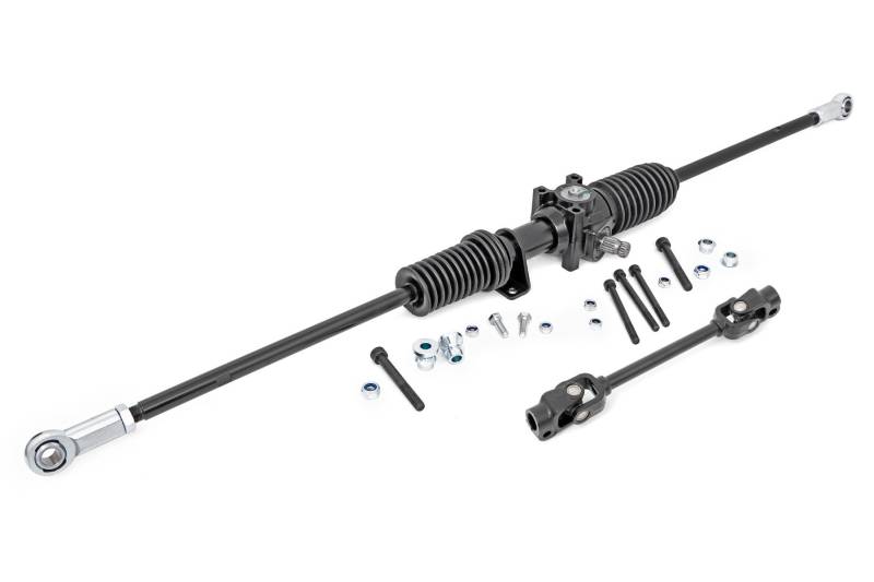 Don't let poor steering lead you off course: If you're looking for a heavy-duty rack and pinion system that guarantees precision steering, look no further than our upgrade for the Polaris Ranger RZR 800 S. Designed to maximize your UTV's performance, this kit tackles sloppy steering so you can confidently navigate rough terrains. Built for both hard work and off-road adventure, it's the perfect upgrade to enhance your Ranger RZR experience.Heavy-Duty, High-Performance Design: Rough Country's Rack and Pinion Kit for the Polaris Ranger RZR 800 S is engineered to outperform the stock OE system. Featuring a robust 22mm knuckle connection shaft with a 27% diameter increase over OEM shafts, and an 18.8mm spline diameter that's 25% larger than the original, this kit is built for durability and strength. The black e-coat finish provides exceptional corrosion and chip resistance, ensuring your rack and pinion system stays looking sharp while standing up to the toughest conditions. Plus, with the improved number of turns (3.33 vs 3.16) and increased driving torque (1.5NM vs 1.3NM), you'll experience smoother, more responsive handling with every twist of the wheel.Upgraded Steering Shaft for Ultimate Strength: The kit includes a heavy-duty steering shaft designed to withstand extreme conditions. With hot-forged U-joint yokes and a 9.375% increase in U-joint bearing diameter, the upgraded steering shaft delivers the rugged reliability you need to tackle even the harshest terrains. This shaft ensures top-notch performance and durability, so you can push your Ranger RZR to its limits without compromising on control.Effortless Installation & Peace of Mind: Our Rack and Pinion Kit comes with all the hardware you need for an easy, straightforward installation. And with Rough Country's industry-leading limited warranty, you can drive with confidence knowing your kit is backed by our commitment to quality and performance.