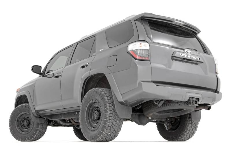 Superior Design. Rough Country's 3-inch Bolt-On Kit offers easy installation and aggressive good looks at an incredible value. Take your 4Runner to new heights with this excellent option for your fifth-generation Toyota 4Runner.\ Durable Components. This kit features a set of high-quality, lightweight, forged aluminum Upper Control Arms designed to make alignment adjustments easier and durable rubber bushings. These arms are designed to promote a factory-like geometry by keeping the ball joint at optimum angles after lifting. This design allows for an improved, greater range of motion from the ball joint, with less stress, wear and tear. Rough Country's 3-inch Bolt-On Kit features N3 nitrogen-charged shocks, giving your truck incredible ride-quality both on and off-road. Also included are a set of N3 loaded struts and rear coil springs to provide lift height from front to rear. Once installed, this kit gives your truck plenty of ride height for larger tires while offering a clean, level look from front to rear.\ Installation. Rough Country's bolt-on 3-inch Bolt-On Kit are easy to install, 100% bolt-on, and require no drilling. Plus, they come with all the necessary hardware included. With an estimated install time of 3-4 hours, you can enjoy your new sliders in no time.\ Limited Lifetime Warranty. Rough Country's 3-inch Bolt-On Kit is backed with a limited lifetime replacement warranty towards manufacturer defects. As such, the product is protected from structural and workmanship damage after the date of purchase. With our industry-leading warranty, give yourself peace of mind when using Rough Country's products!