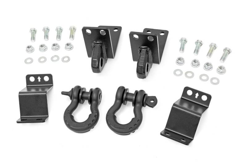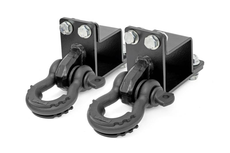 Equip your fourth-generation Tacoma with Rough Country's Rear D-ring Shackle Kit! This isn't your average add-on—it's a game-changer for your truck's off-road capabilities.\ Easy Access Rear Recovery Points: When you're deep in the mud or tackling rough terrain, you need quick and easy access to your recovery points. Our D-ring shackle mounts are designed for just that – no fuss, no hassle recovery.\ Eye-catching Black Finish: Who says functionality can't look good? Our kit adds a touch of style to the rear of your Tacoma with its sleek gloss black finish. Not only does it turn heads, but it also ensures durability to withstand the toughest trails.\ Simple Bolt-On Installation: No complicated modifications here! Rough Country's Shackle Mounts bolt around the frame with ease, providing a sturdy and reliable recovery point for any sticky situation you encounter.\ From navigating rough terrain to handling unexpected obstacles, our Rear D-Ring Shackle Kit is built to tackle whatever the trail throws your way. Don't settle for anything less – equip your Tacoma with Rough Country’s Rear D-Ring Shackle Kit today!