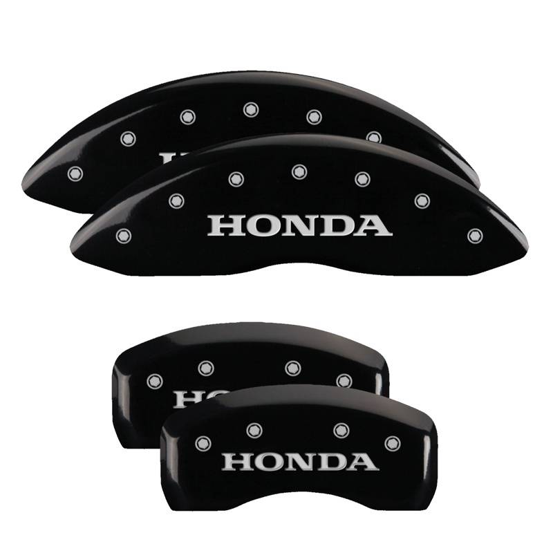 Set of 4 caliper covers, Engraved Front and Rear: Honda, Black powder coat finis MGP Caliper Covers are a car accessory designed and manufactured specifically for your 2009-2023 Honda Pilot to cover up and hide those ugly brake calipers. These aluminum caliper covers are finished with a high-quality powder coat. MGP caliper covers will enhance your wheel appearance and curbside appeal with either black, yellow or red caliper covers. MGP Brake Caliper Covers are tested for safety fitment and are licensed by major manufacturers.
