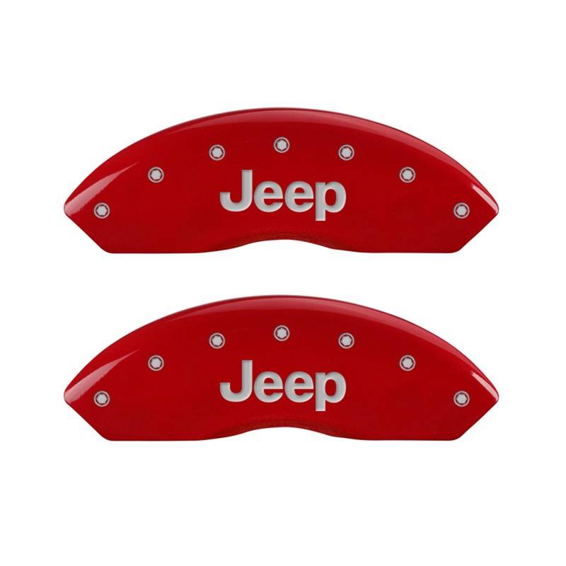 Front set 2 caliper covers, Engraved Front: JEEP, Red powder coat finish, silver MGP Caliper Covers are a car accessory designed and manufactured specifically for your 1997-2006 Jeep Wrangler to cover up and hide those ugly brake calipers. These aluminum caliper covers are finished with a high-quality powder coat. MGP caliper covers will enhance your wheel appearance and curbside appeal with either black, yellow or red caliper covers. MGP Brake Caliper Covers are tested for safety fitment and are licensed by major manufacturers.