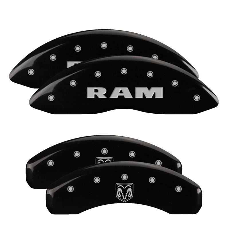 Set of 4 caliper covers, Engraved Front: RAM - Engraved Rear: RAMHEAD, Black pow MGP Caliper Covers are a car accessory designed and manufactured specifically for your 2011-2024 RAM 1500 to cover up and hide those ugly brake calipers. These aluminum caliper covers are finished with a high-quality powder coat. MGP caliper covers will enhance your wheel appearance and curbside appeal with either black, yellow or red caliper covers. MGP Brake Caliper Covers are tested for safety fitment and are licensed by major manufacturers.