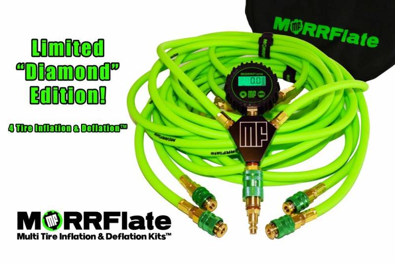 Inflate, Deflate, and Equalize up to 4 tires with no installation, and no prep. Just pull your MORRFlate out of its storage bag, hook it onto your tires, and grab a drink while all your friends get their squats in. The MORRFlate hose kits are made with simplicity and durability in mind. It is rated for up to 22CFM, 140psi, -40 to 180 degrees F. It is kink and abrasion resistant, it does not hold memory, has a slick outer coating for easy cleaning, and there is no installation required. The regular Quad 125 will fit up to 125" wheelbase vehicles with an air source in the middle of the front bumper, middle of the rear bumper, or center of either side of the vehicle (under seat mounted compressors). If you need a longer wheelbase, check out the MORRFlate Quad+ 155 Off Road 4-Tire Inflation Deflation Kit.