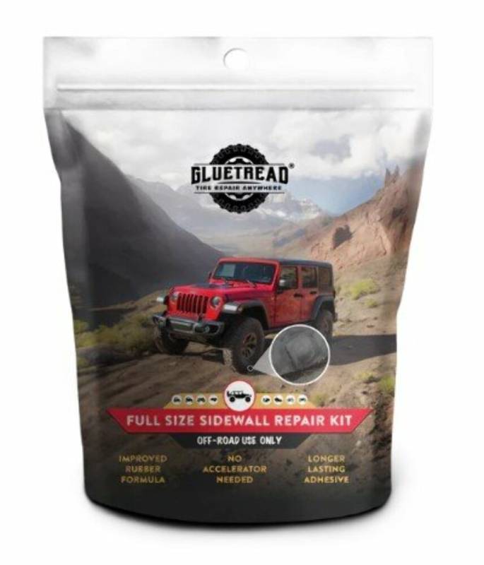 Have a gash or sidewall blowout on your 4x4, SxS, Jeep, Toyota, rock crawler, or trophy truck while out on the trails?? Definitely check out this awesome sidewall repair kit from Glue Tread! The new GlueTread Full-Size Kit includes our improved rubber formula and doesn't include the accelerator. Here's why: We've improved our rubber formula, which allows the adhesive to cure more quickly without the accelerator. Additionally, keeping the accelerator out of the kit allows the adhesive to last longer. When the accelerator and adhesive are stored side by side, it actually causes the adhesive to slowly cure within the tube. We received a lot of feedback that patches applied without the accelerator adhere better and last longer on a compromised sidewall. The cure time without the accelerator and the improved rubber formula is about ten minutes. For off-road use only.