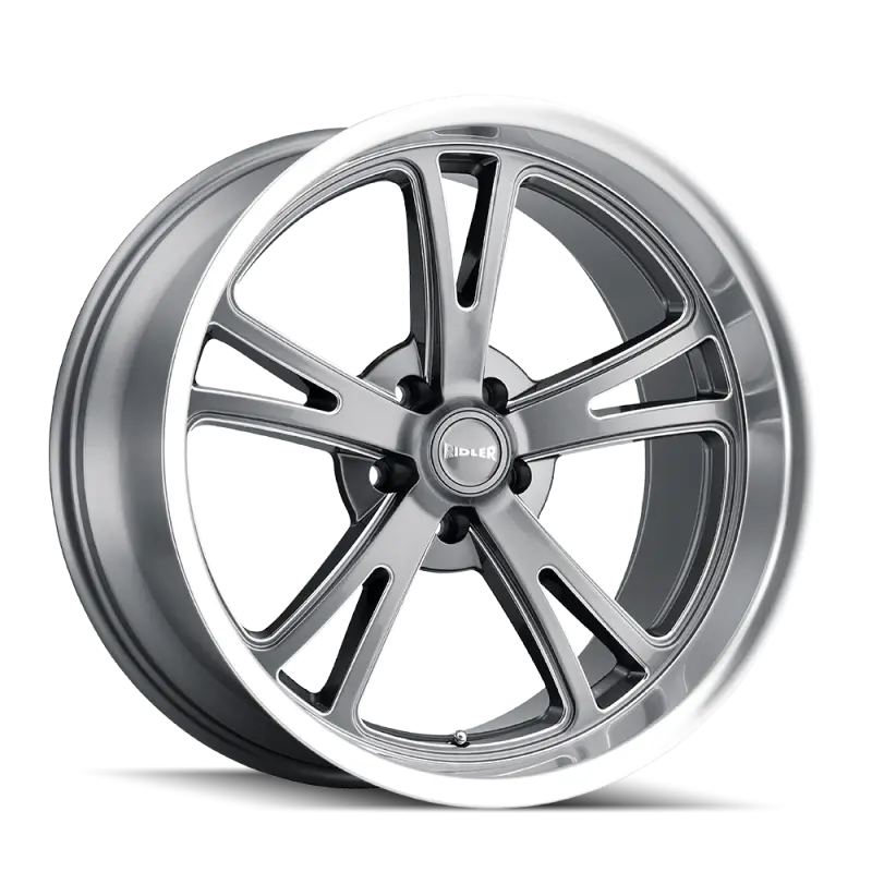606 (606) GLOSS GREY MACHINED THE ROOTS RUN DEEP IN CAR CULTURE AND THAT PASSION CONTINUES TO PASS THROUGH THE GENERATIONS. RIDLER CUSTOM WHEELS PAYS TRIBUTE TO THE LOVE OF THE AUTOMOBILE SPANNING FROM HOT RODS RESTO MODS CLASSICS MODERN MUSCLE AND MUCH MORE. WITH A VISION TO WRITE A NEW CHAPTER IN HISTORY OUR DESIGNS CAPTURE THE PERFECT STYLE TO MOLD YOUR DESIRE INTO REALITY. RIDLER BUILDS WHEELS CATERING FROM 15" THROUGH 22" INCLUDING STAGGERED FITMENTS THAT GIVE YOU THE IDEAL FITMENT. ALL OF OUR WHEELS ARE BACKED BY A PROMISE THAT ENSURES ONLY THE HIGHEST QUALITY ALLOYS ARE USED WHICH EASILY SURPASS THE INDUSTRY'S MOST STRINGENT STANDARDS. LET OUR INGENUITY GO BEYOND YOUR EXPECTATION. RETRO SPLIT 5 SPOKE DESIGN MODERN LIP DESIGN AVAILABLE IN STAGGERED AND NON-STAGGERED APPLICATIONS MATTE BLACK GREY W/ MILLED SPOKES OR CHROME FINISHES AVAILABLE ADVANCED MANUFACTURING METHODS CREATES A STRONG PERFORMANCE CAPABLE WHEEL