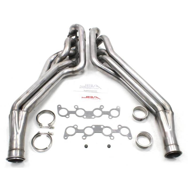 JBA long tube headers are the number one choice for maximum performance gains and high RPM efficiency. Available in 409 or 304 Series Stainless Steel. These long tube designs are dyno and race proven to deliver the greatest possible increase in horsepower and torque throughout the RPM range. All JBA long tube headers feature large mandrel-bent stainless steel primary tubes, oversized exhaust ports, extra thick 3/8 one-piece flanges, and proprietary JBA Firecone® merged collectors for smooth flow. Each system is designed to give the maximum amount of ground clearance possible, so lowered cars do not drag the collectors.\n304 Series Stainless Steel headers are built to endure the harshest of environments, ensuring your investment stands the test of time. These headers are embellished with 304 flanges, longer, smoother 304 merged collectors and 304 primary tubing. Our proprietary JBA Firecone has been extended with a longer concave design within the collector for optimal flow. Available in natural finish or a meticulously hand polished mirror finish.\nEach system includes high quality hardware and thorough instructions for a professional no-leak installation. For closed course competition use only.