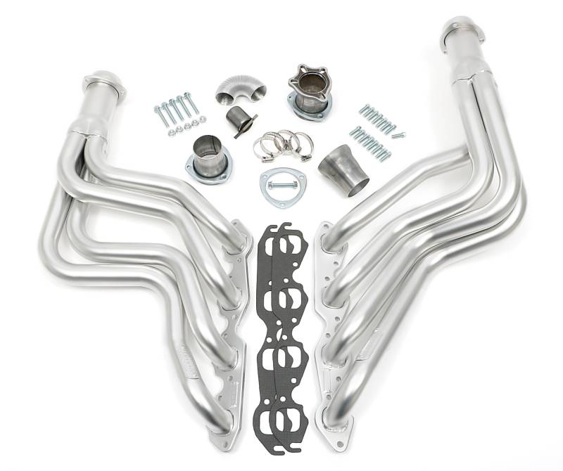 HD Silver Long-Tube Headers For 64-77 Chevelle 396-502 No A.I.R. Heavy-Duty ELITE Header Construction With Thick 3/8 in. Flanges and 14g Primary Tubes To Hold Up To The Added Tortures Of High-Performance and Truck Engines. Thermal Coating Keeps More Heat In The Headers To Keep Underhood Temps Down and Protect Against Corrosion. Ball & Socket Collector Design requires No Gasket, and Allows For More Exhaust System Misalignment than Old School, Gasket-Style Header Collectors Includes All The Necessary Mounting Hardware, Gaskets and Reducers (exhaust adapters) Limted Lifetime Warranty On Construction, Five Year Warranty on Factory-Applied Header Coating!