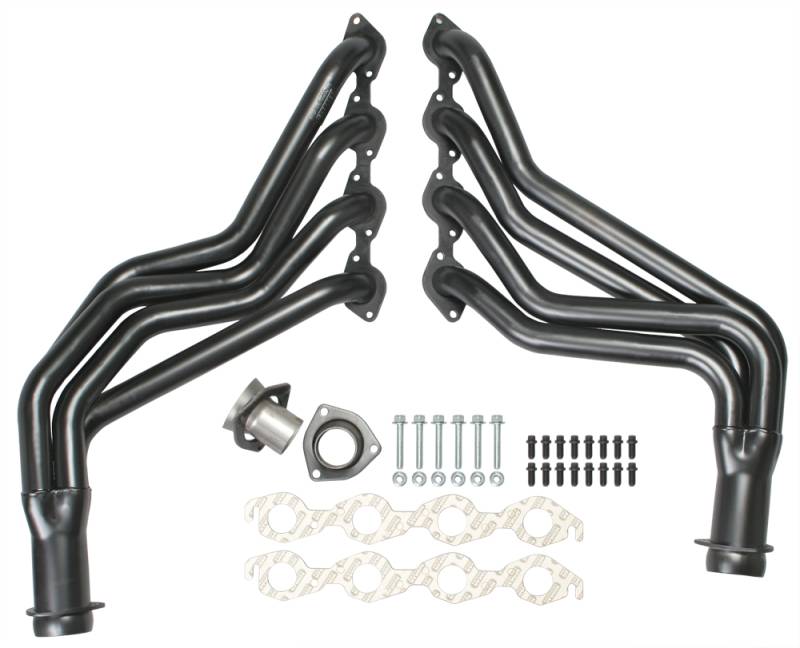 Handcrafted, Mild Steel Construction. Long Tube Header Design Provides Excellent Top-End Horsepower and Torque. Ball & Socket Collector Design requires No Gasket, and Allows For More Exhaust System Misalignment than Old School, Gasket-Style Header Collectors Includes All The Necessary Mounting Hardware, Gaskets and Reducers (exhaust adapters) Limted Lifetime Warranty On Construction, Five Year Warranty on Factory-Applied Header Coating!Details